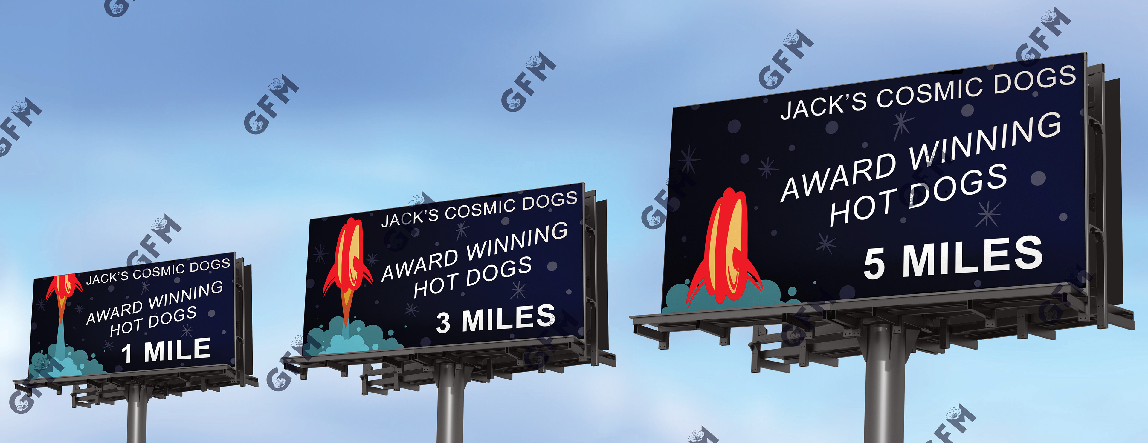Set of 3 billboard mockup designs for Jack's Cosmic Dogs [spec work]